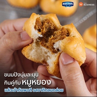 สำหรับเมนูที่เราใช้ “สวีท เบเกอรี่ มายองเนส ตราเบสท์ฟู้ดส์” ก็จะมีเมนู “ขนมปังหมูหยองน้ำสลัด” เราใช้มาตั้งแต่แรกเลย เวลากินคู่กับหมูหยองแล้วเข้ากันพอดี รสชาติกลมกล่อม